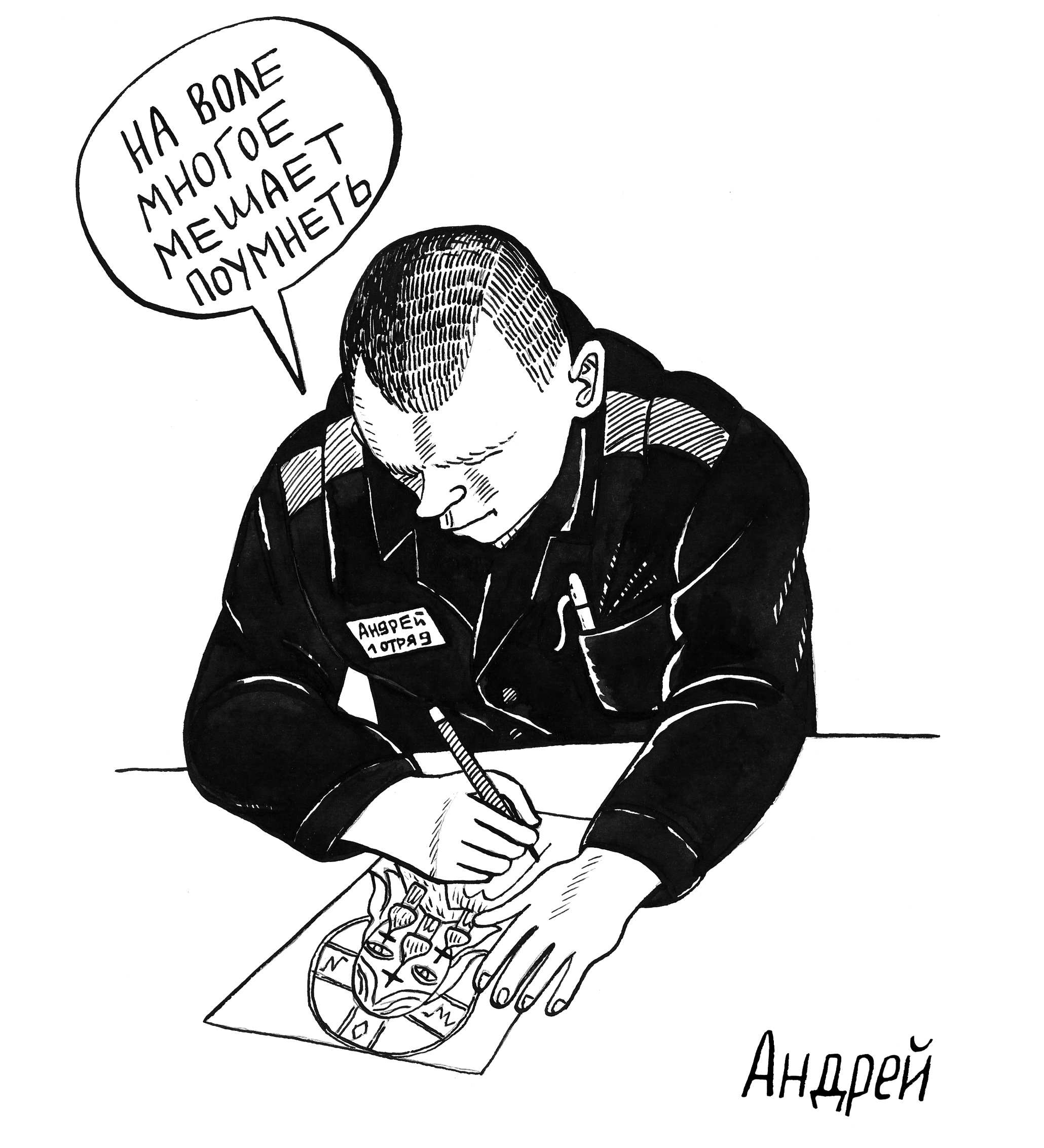 lomasko-prison-3Andrei: “On the outside, lots of things keep a guy from wising up.”