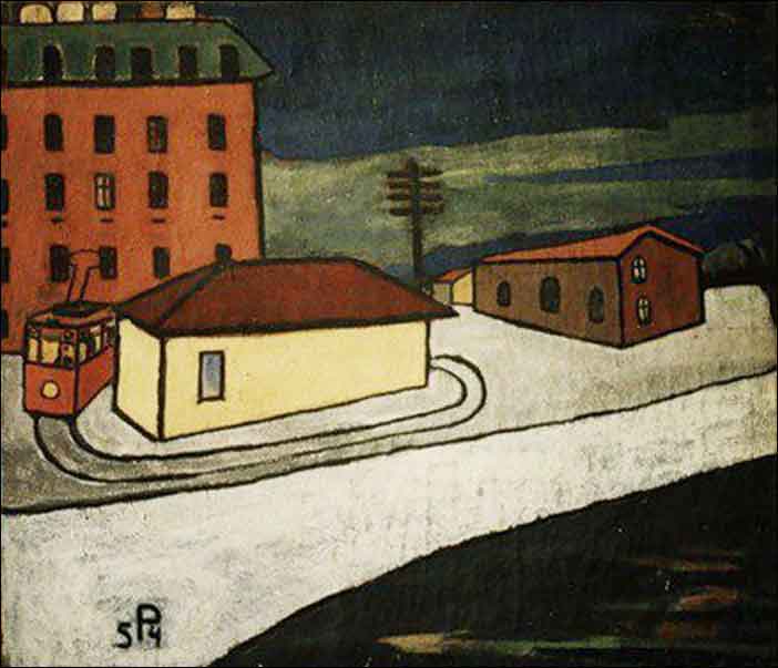 Along with the inner Petersburg district of Kolomna, these were Vasmi’s stomping grounds. It was in these places that the artist produced landscapes that beg the epithet “metaphysical.” But they bear only a superficial resemblance to Giorgio de Chirico’s paintings as they were the product of natural observations made outdoors.