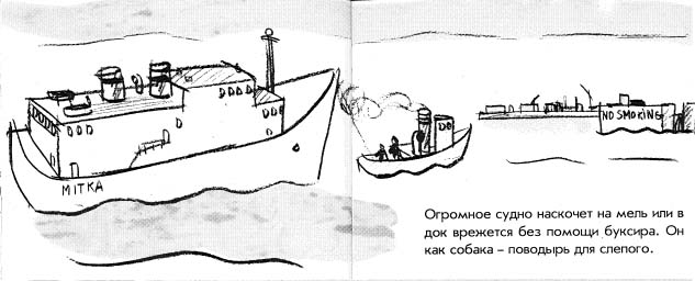 Without help from the tug, the huge ship would run aground on a sand bar or crash into a dock. The tug is like a guide dog for a blind man.