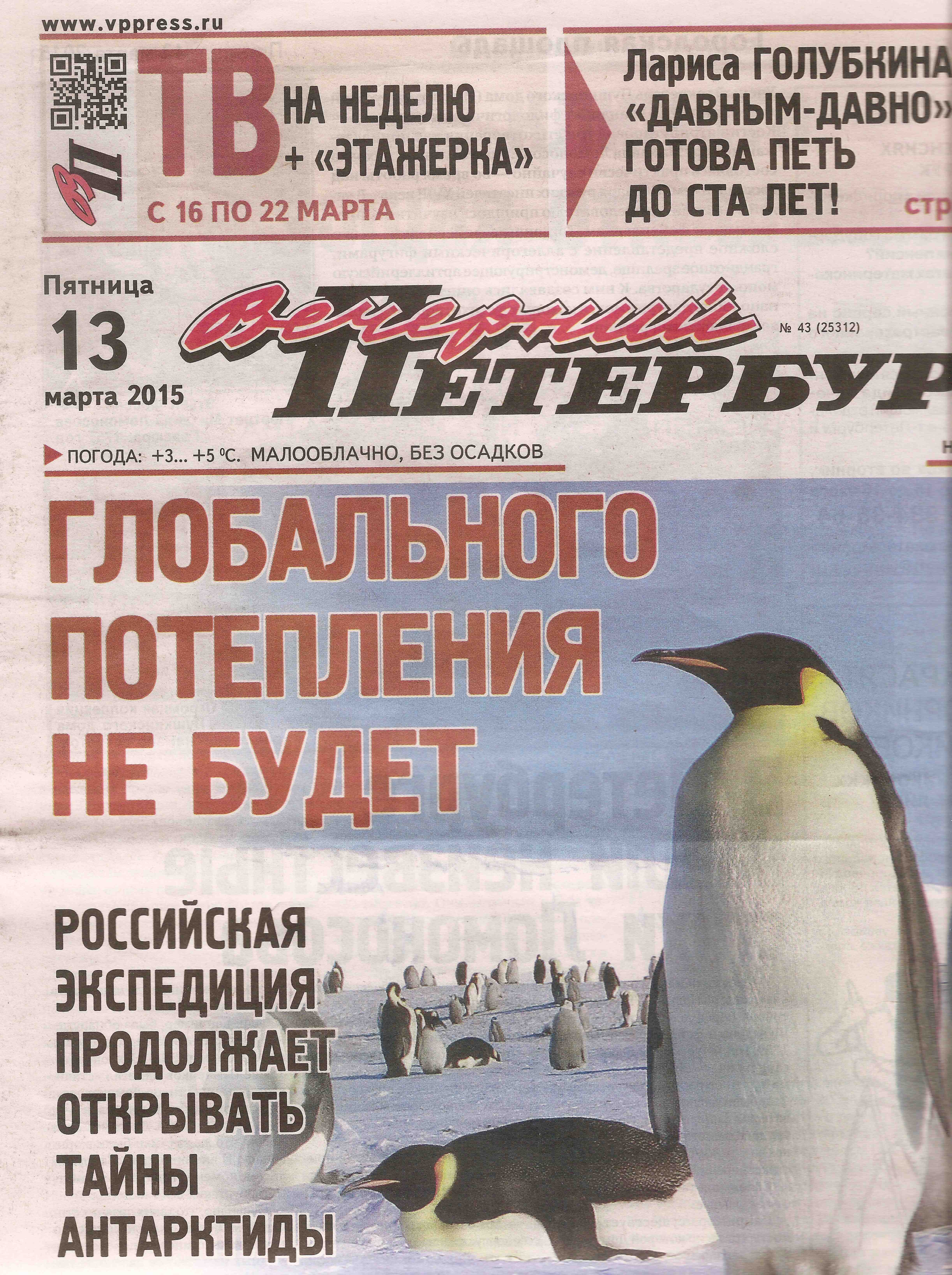 “There will be no global warming. Russian expedition continues to uncover the secrets of Antarctica.” Front page of the March 13, 2015, edition of Vechernyi Petersburg newspaper.