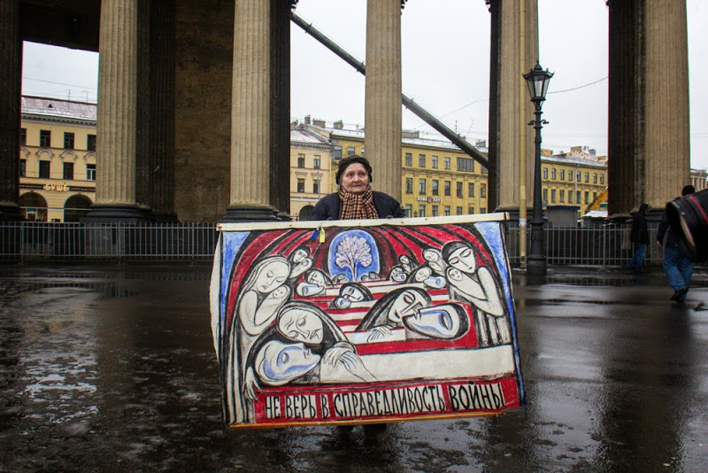 Artist Yelena Osipova holds a poster that reads, “Don’t believe in the justice of war,” during an unauthorized anti-war protest outside Kazan Cathedral in Petersburg on March 15, 2014. Photo by Sergey Chernov