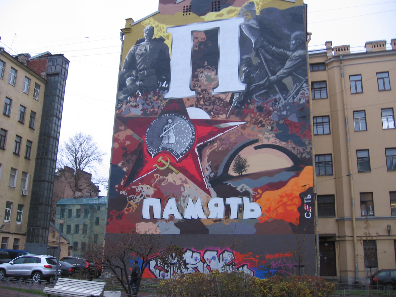 Memory (P = Pamiat’), one of a series of graffiti-like murals produced by the pro-Kremlin youth group Set (“Network”) to celebrate the president’s birthday in October 2014. This mural was painted on the firewall of an apartment block on the Obvodny Canal in Petersburg. Fortunately, it has since been painted over. Photograph by the Russian Reader
