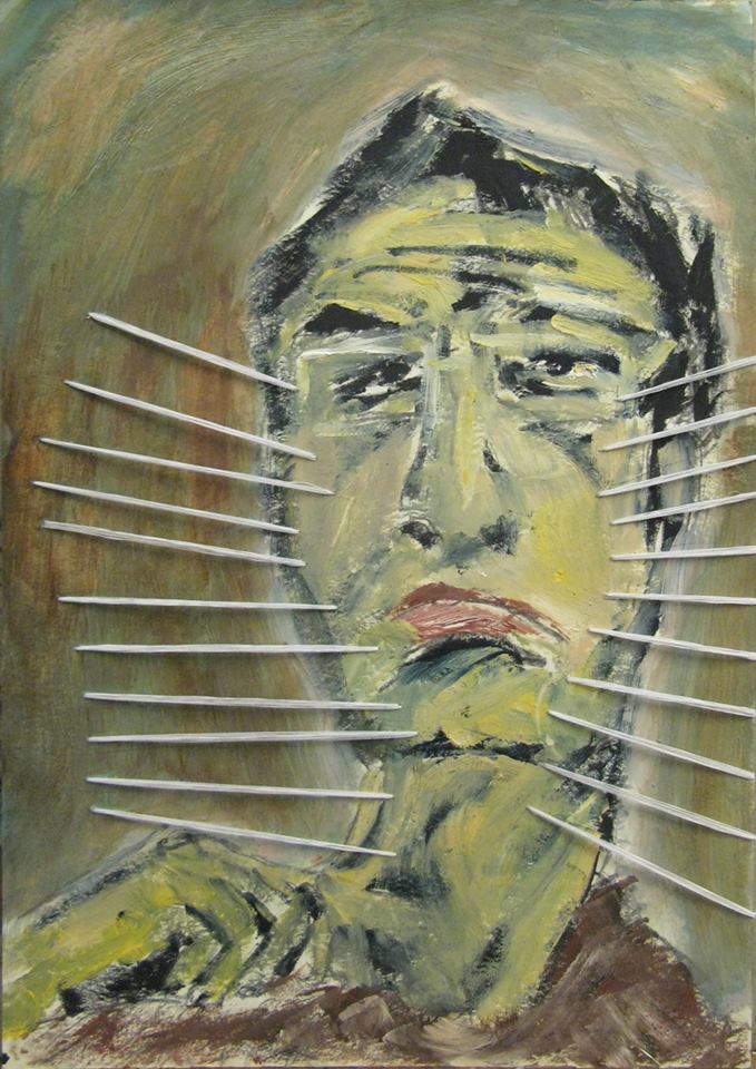 Yuri Leiderman, St. Sebastian (Stitched from Whole Cloth) [Св. Себастьян (шито белыми нитками)], 2018. Oil and thread on paper, 42 cm x 30 cm. Courtesy of the artist. All rights reserved