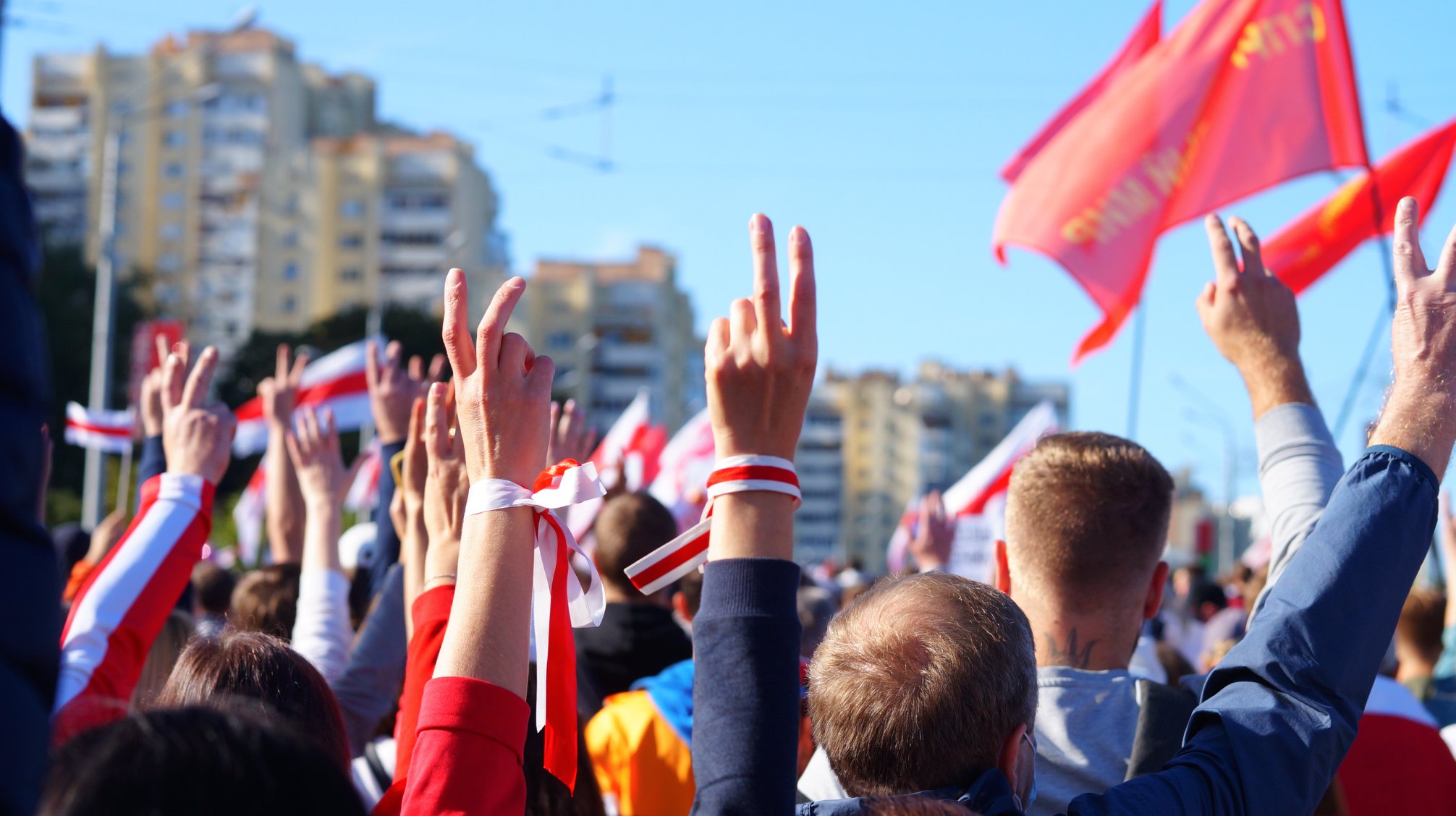 People holding red-and-white protest flags gathered at the “March of Justice” that occupied the whole of a central avenue and walked towards the heavily guarded Palace of Independence, where Lukashenko has his offices.