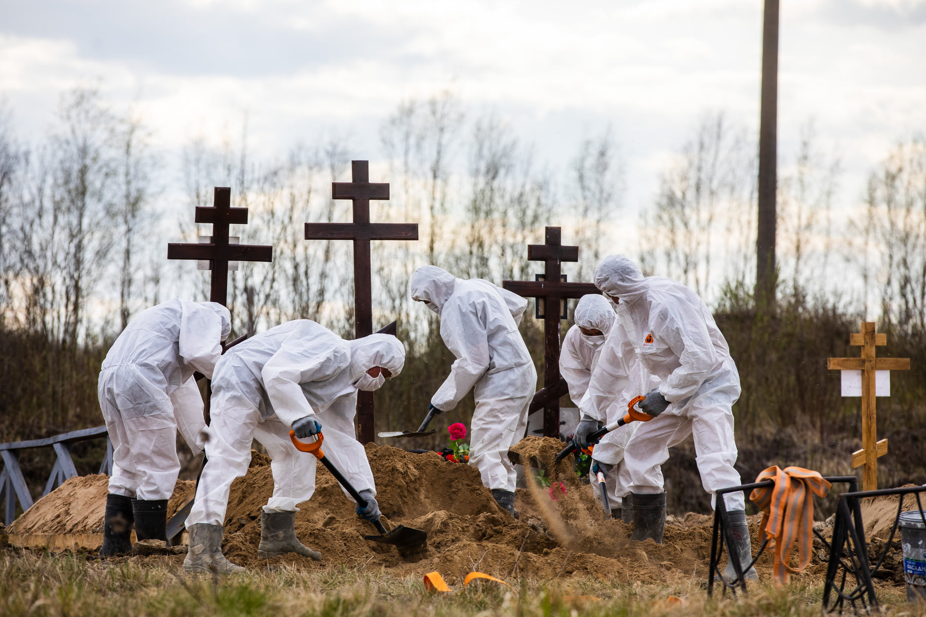 May 8, 2020. A burial at the coronavirus section of the New Kolpino Cemetery near Petersburg.