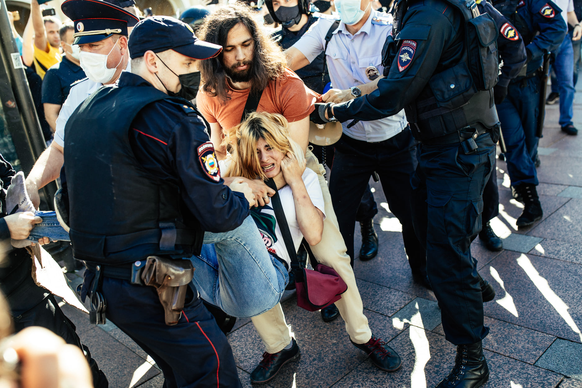 August 8, 2020. Police detain a young woman during a rally in support of protesters in Khabarovsk near Gostiny Dvor in Petersburg.
