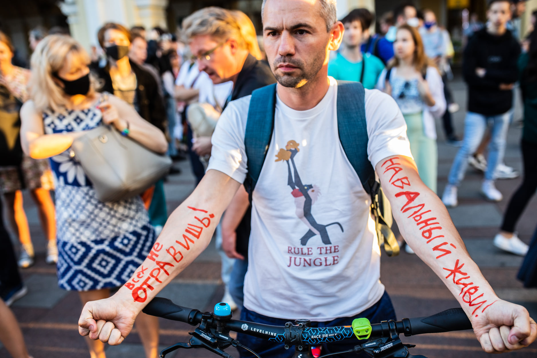 August 21, 2020. Petersburgers gather outside Gostiny Dvor in support of the poisoned Alexei Navalny. The inscriptions on the man’s arms read, “You can’t poison everyone!” and “Live, Navalny!”