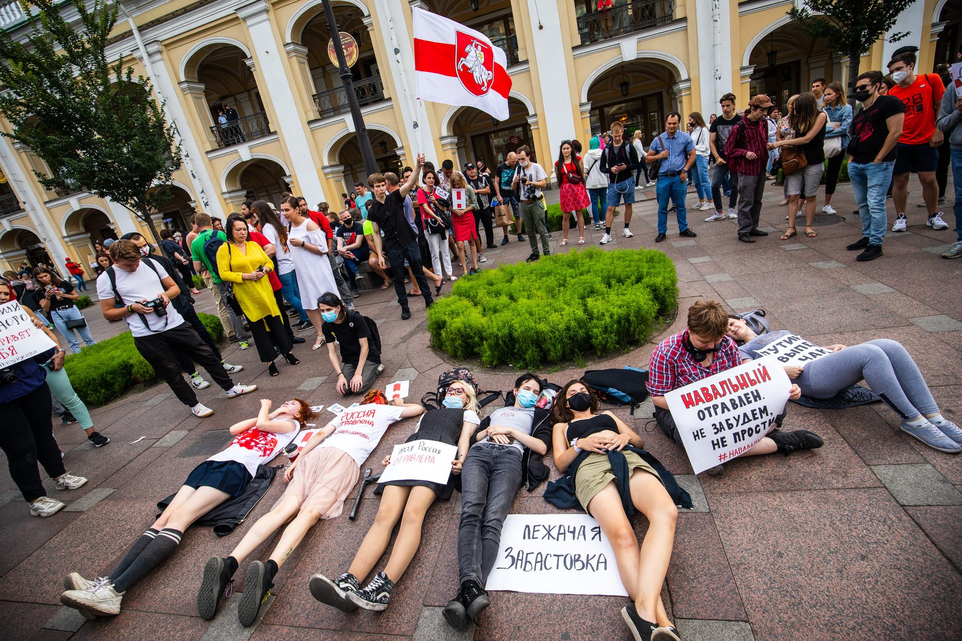 August 22, 2020. Petersburgers gather outside Gostiny Dvor in support of protesters in Khabarovsk and Belarus. The placard between the legs of the young people reads, “Lie-down strike.”