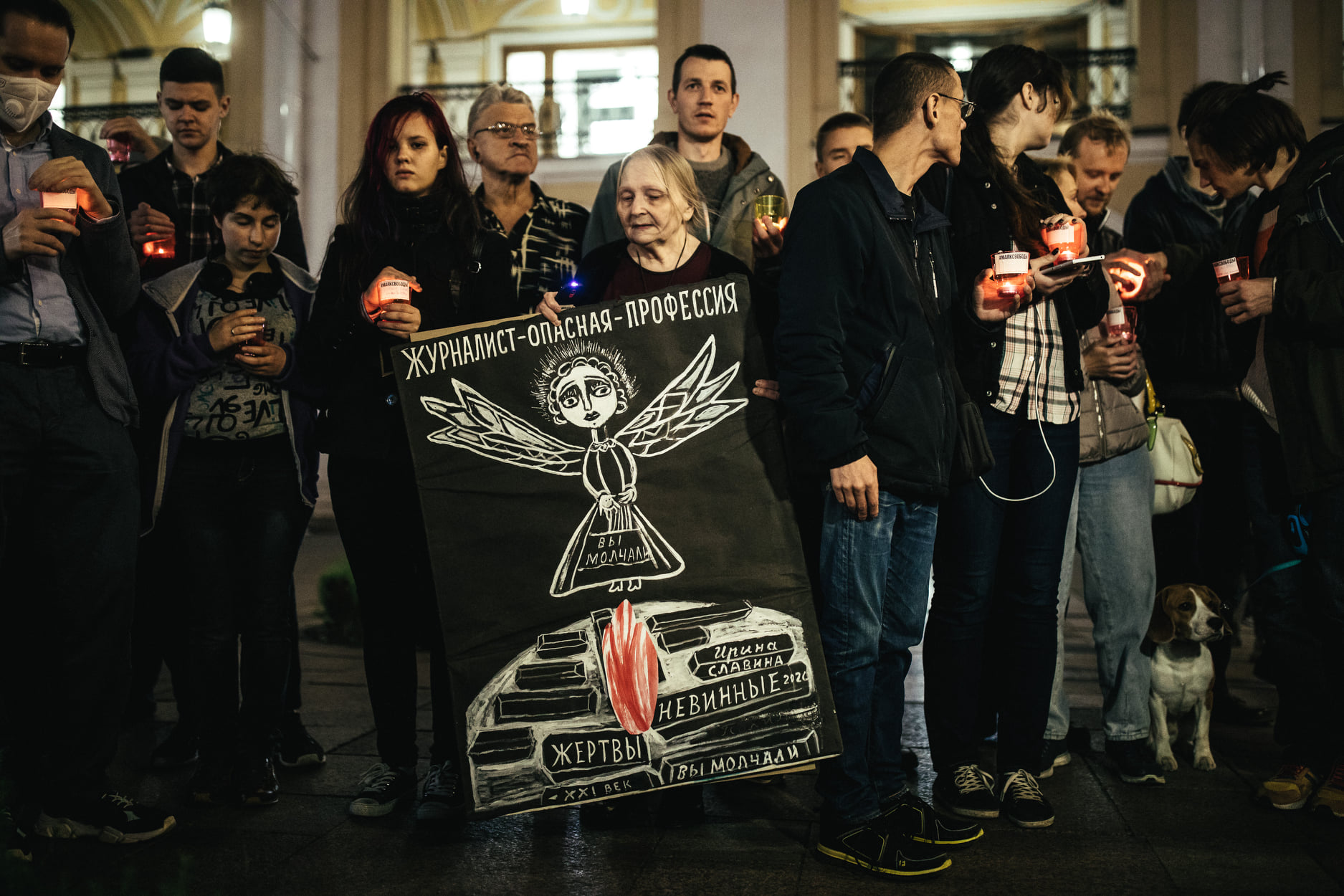 October 3, 2020. A memorial for journalist Irina Slavina outside Gostiny Dvor in Petersburg. The poster held by artist Yelena Osipova reads, “Journalism is a dangerous profession. You were silent. Irina Slavina. Innocent victims of the 21st century. You were silent.”
