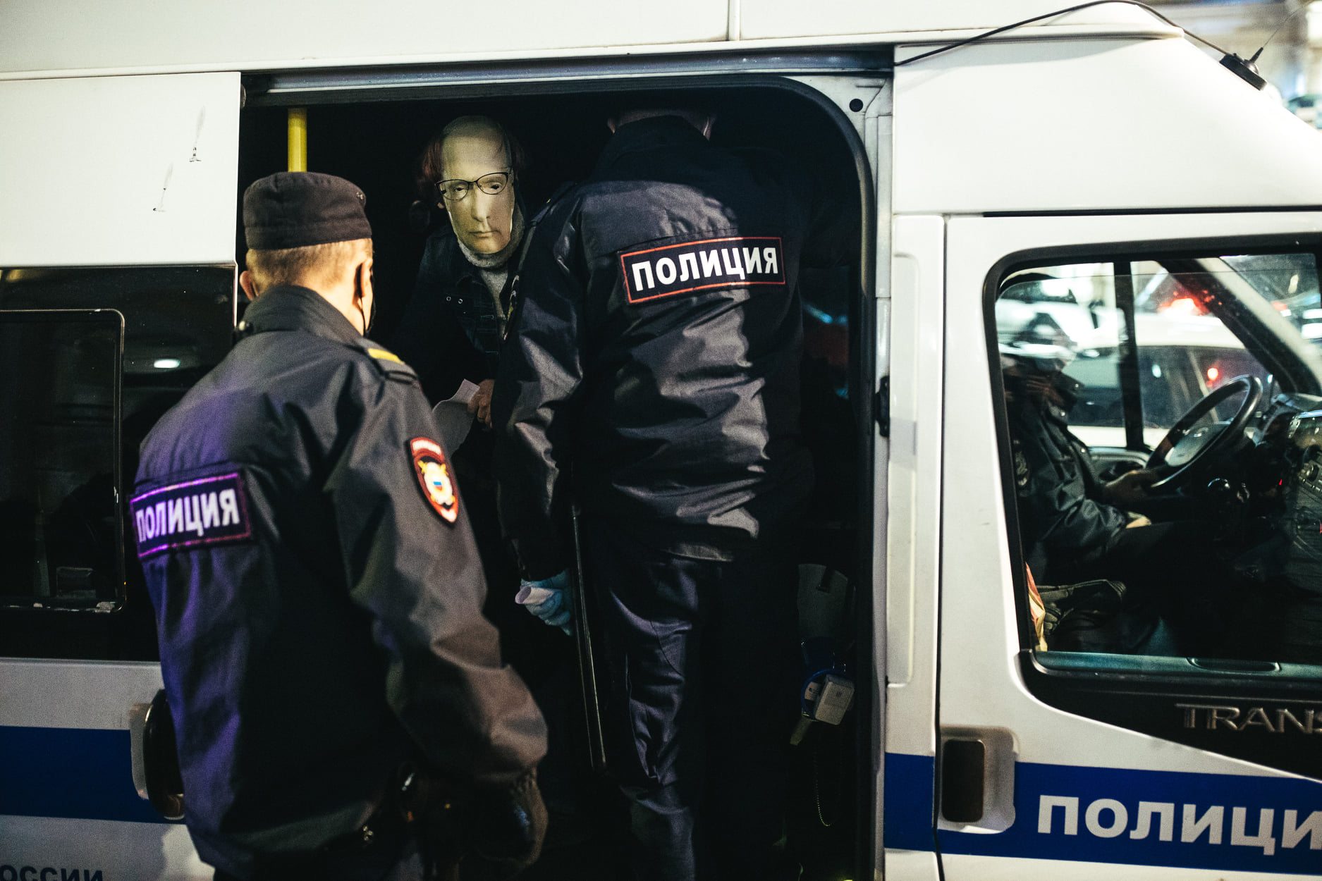 October 7, 2020. A female activist wearing a Putin mask is detained outside of Gostiny Dvor in Petersburg during pickets protesting Putin’s birthday.