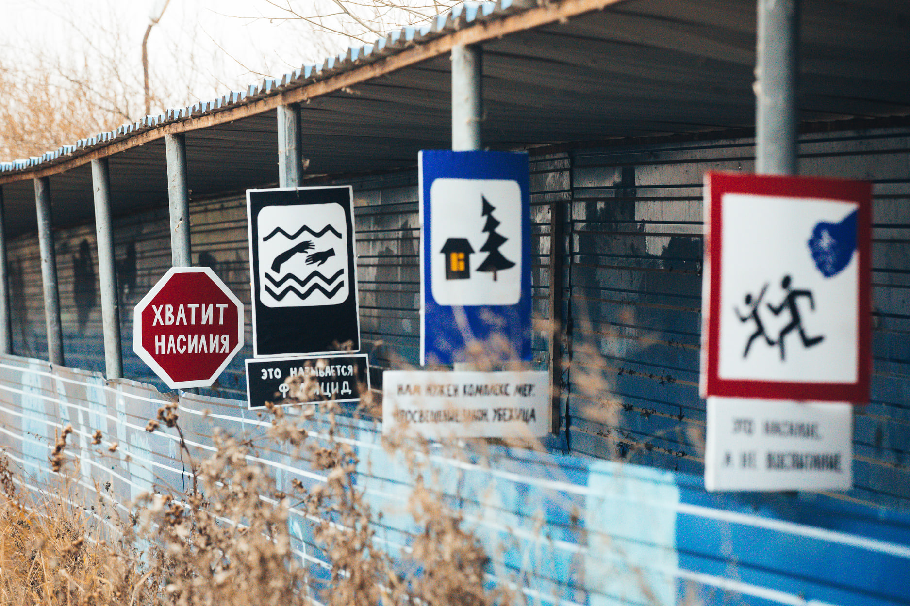 December 6, 2020. Road signs on Bucharest Street in Petersburg protesting domestic violence. The signs on the far left read, “Stop the violence” and “It’s called femicide.”