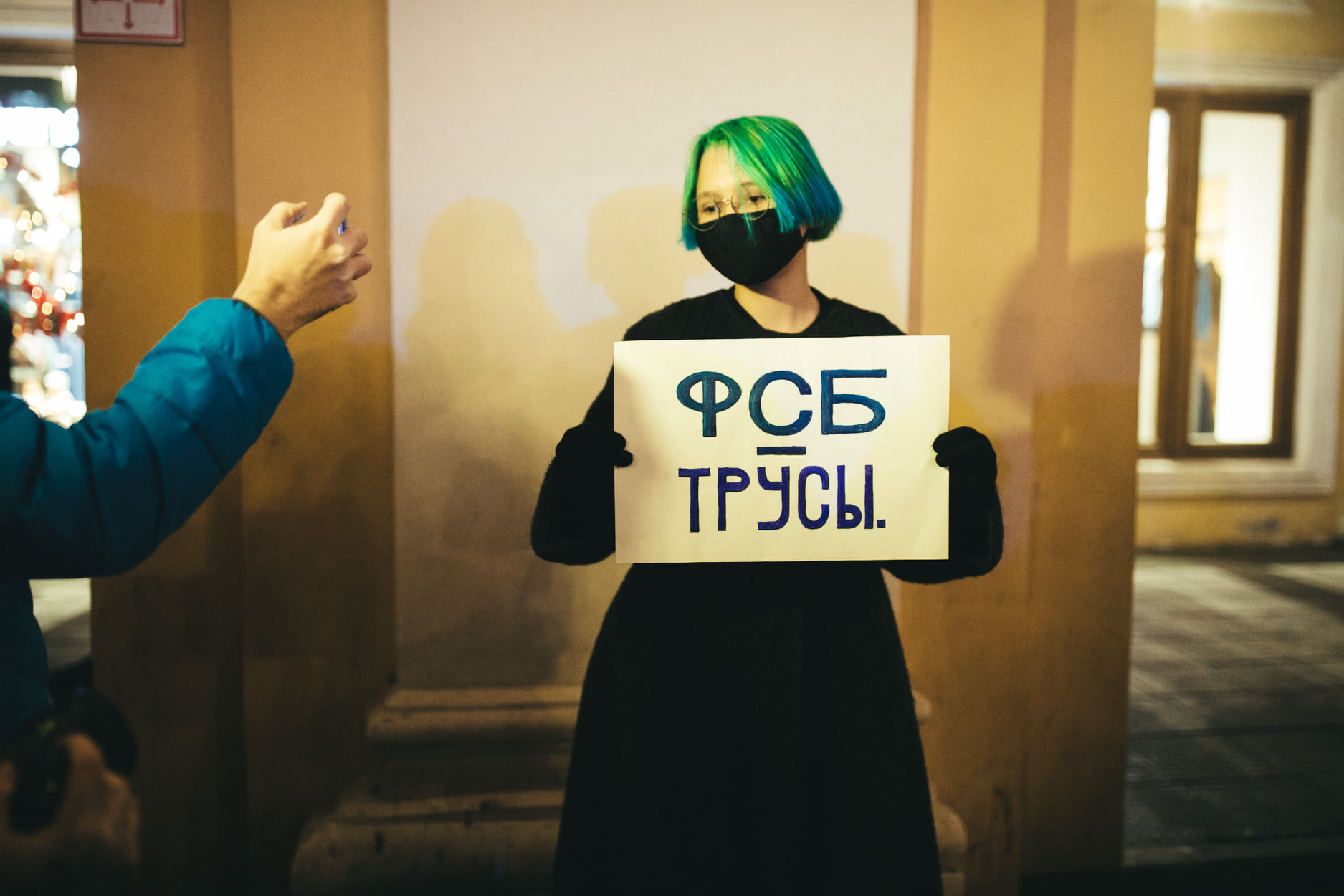 December 22, 2020. Petersburgers picket outside Gostiny Dvor after a journalistic investigation revealed that Russian opposition leader Alexei Navalny had been been poisoned by officers of the FSB, the Russian Federal Security Service. The young woman’s placard reads, “The FSB are cowards/underwear,” a play on the word trusy (which means both “cowards” and “underwear”) and an allusion to Navalny’s phone conversation with one of the agents involved, who claimed that he had poisoned Navalny’s underwear with the deadly nerve agent Novichok.