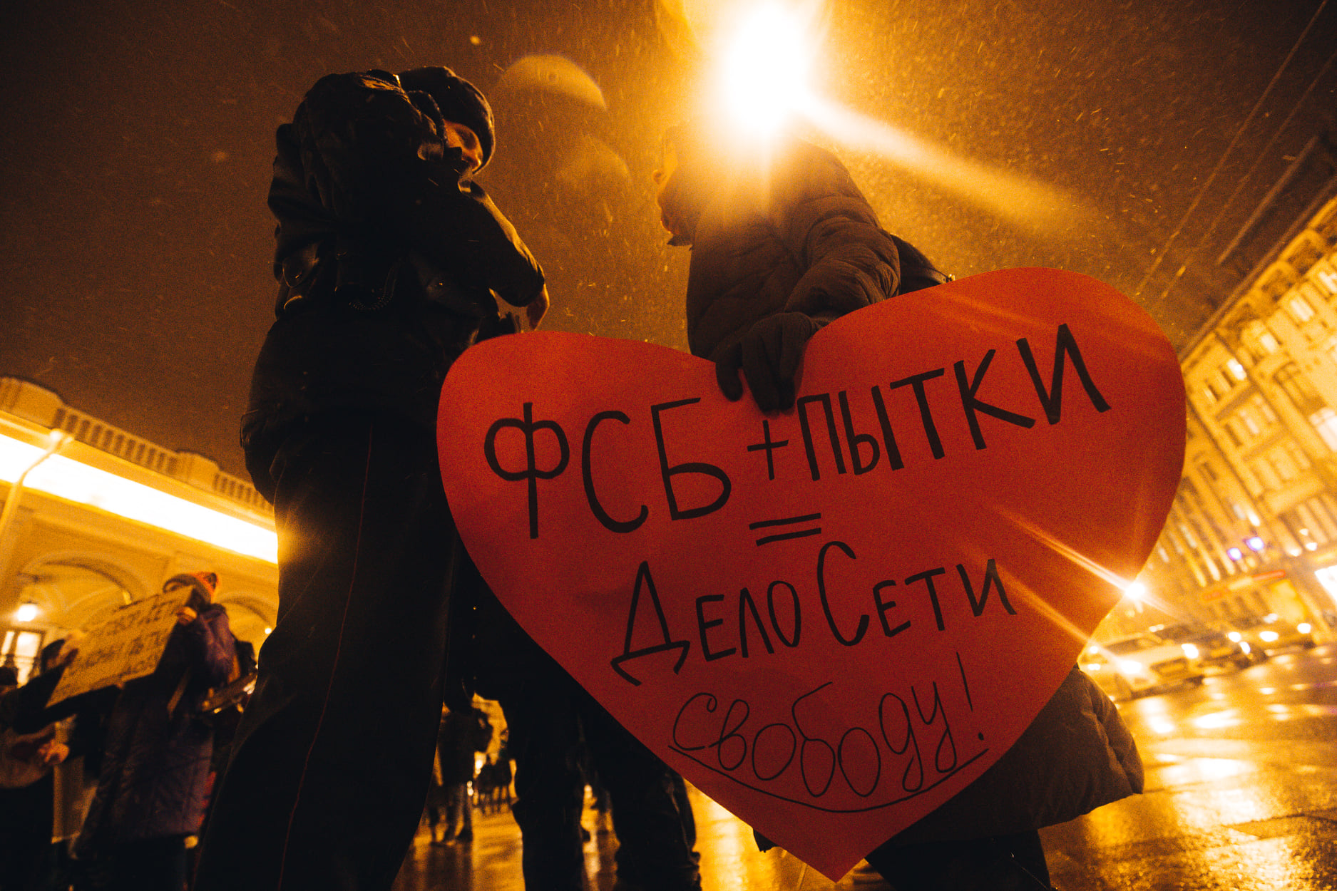 February 14, 2020. Pickets near Gostiny Dvor in Petersburg protesting the verdict in the Network Case. The placard reads, “FSB + torture = Network Case. Free [the defendants]!”