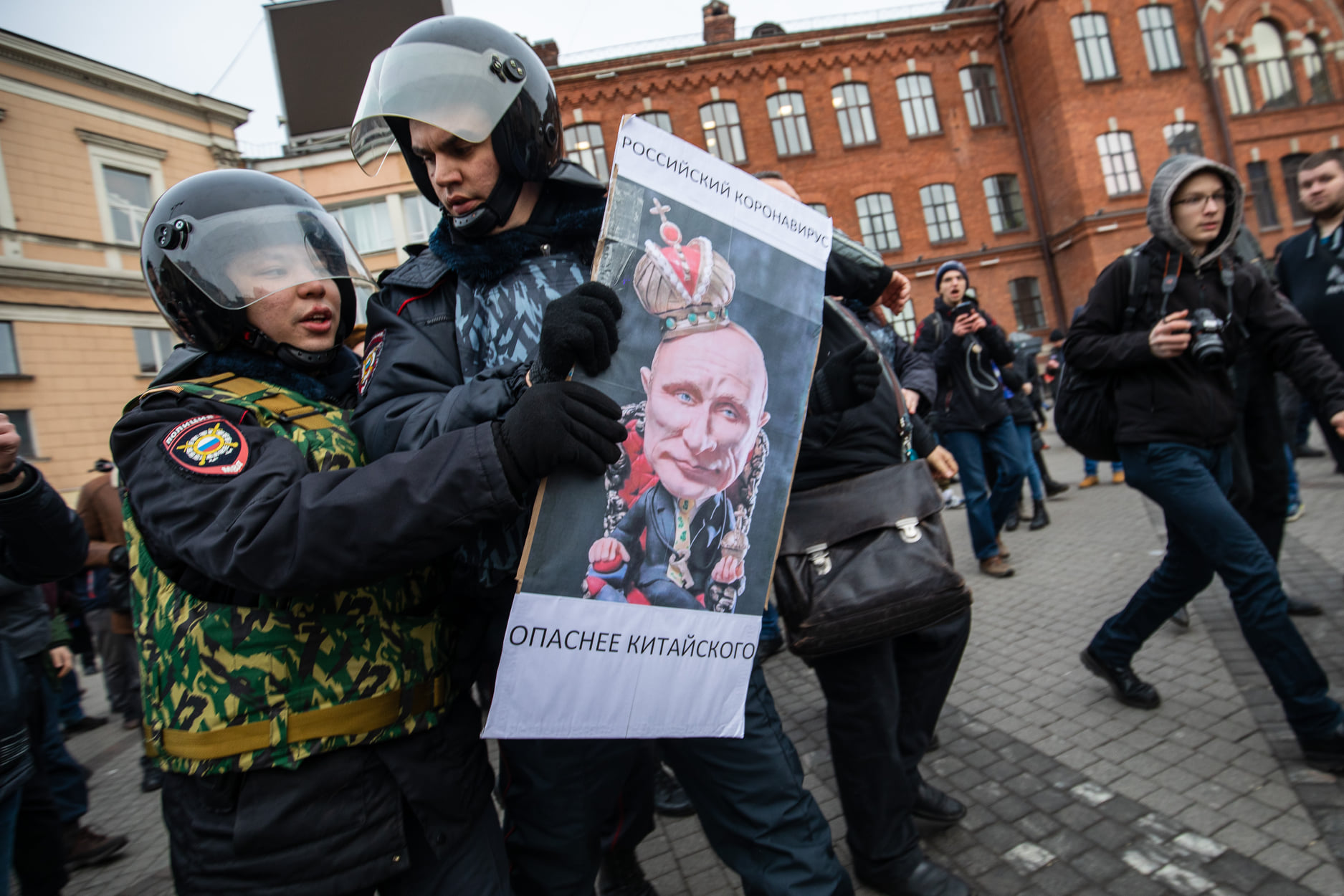 February 15, 2020. Police detain people picketing against proposed amendments to the Russian Constitution on Ligovsky Prospekt in Petersburg. The placard reads, “The Russian coronavirus is more dangerous than the Chinese one.”