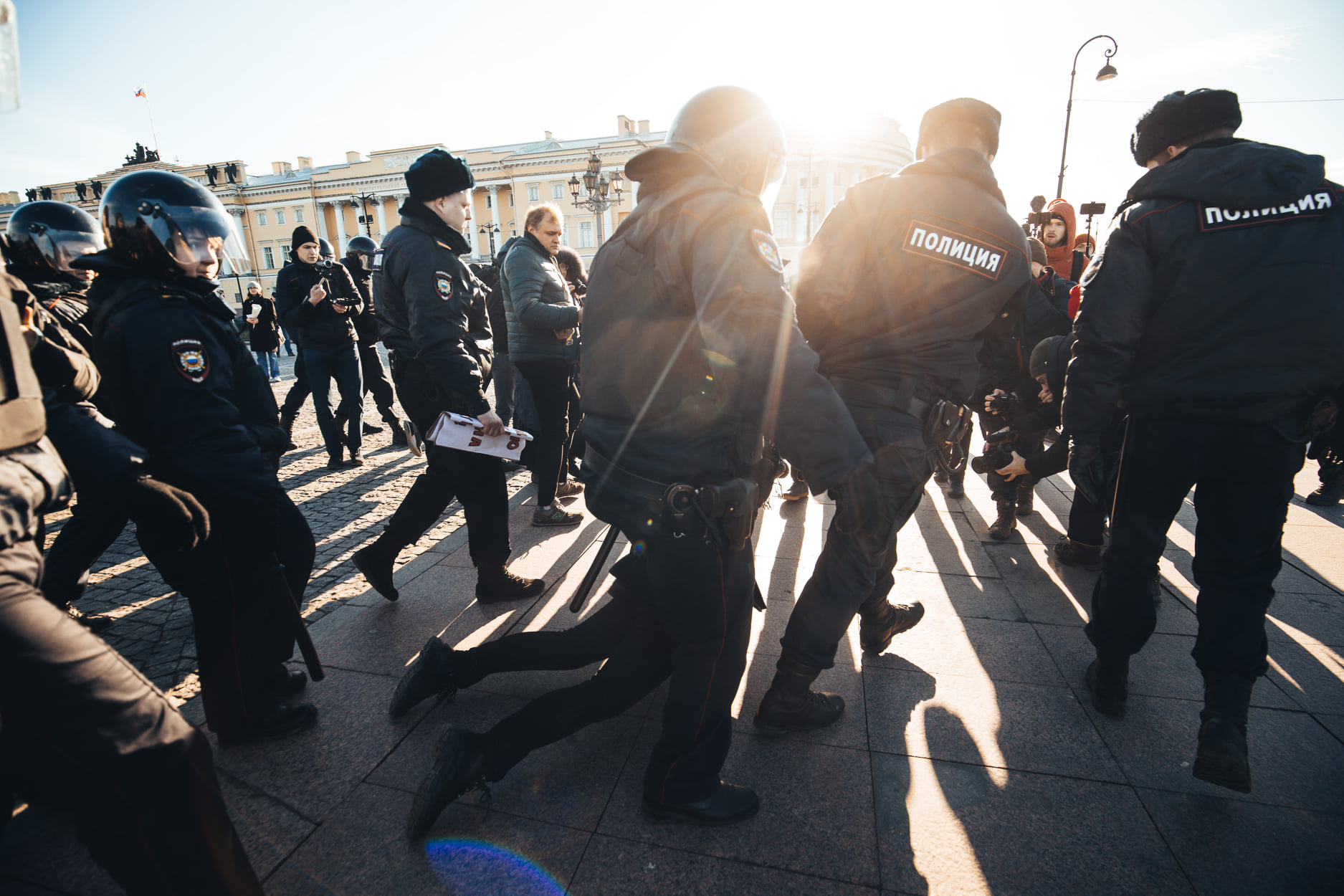 March 15, 2020. Police detain people protesting proposed amendments to the Russian Constitution on Senate Square in Petersburg.