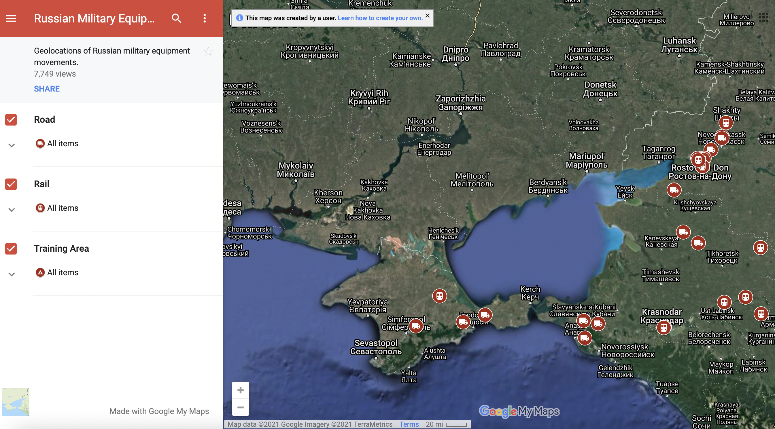 Geolocations of Russian military equipment movements on the borders of Ukraine: an interactive map