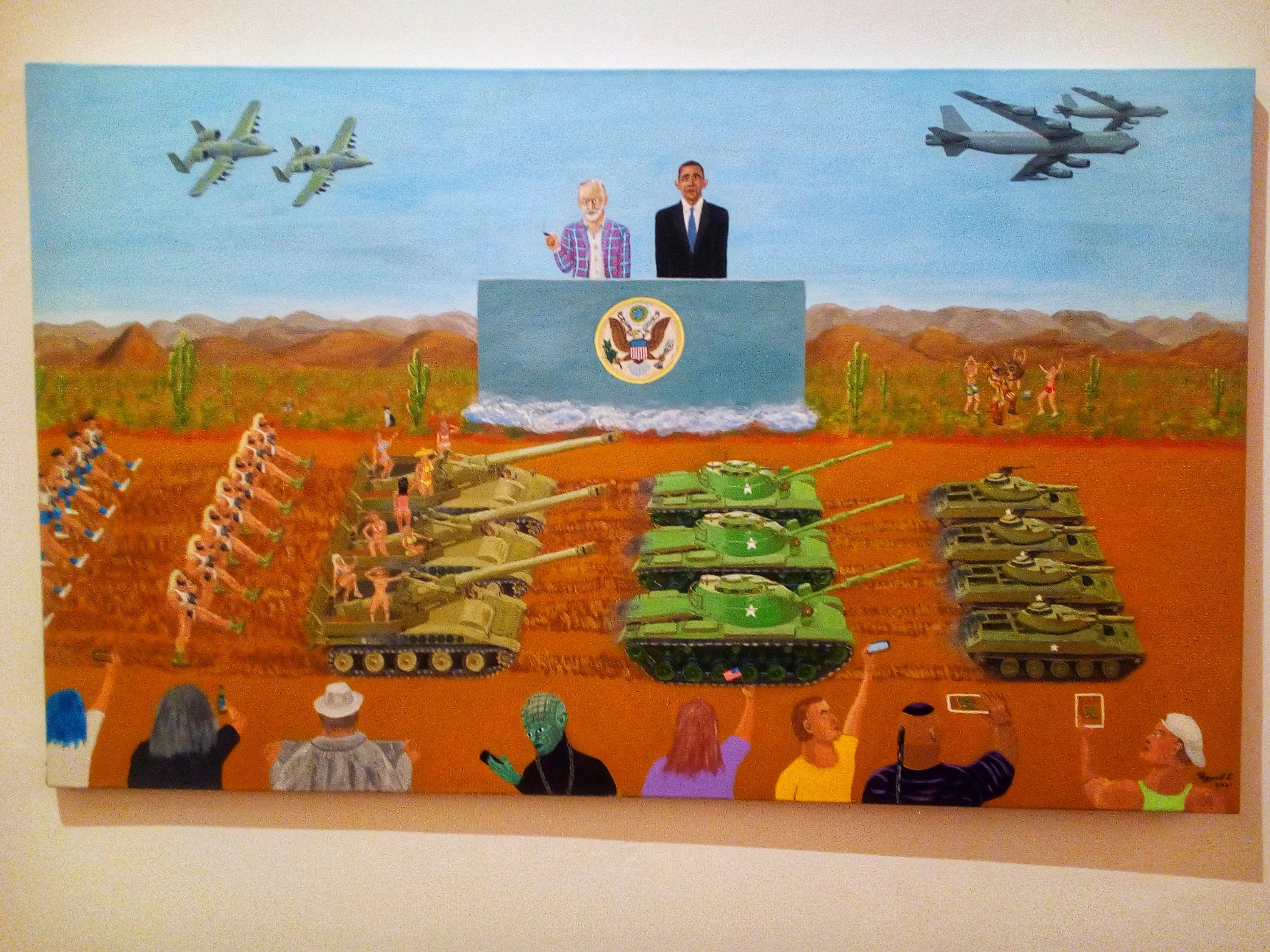 Sergey Fedulov, Freud and Obama at the Parade, 2021. Gouache on paper. Courtesy of Studio 6 at St. Petersburg Municipal Psychiatric Hospital No. 6. Photo courtesy of Mikhail Ryzhov. The painting is currently on view at the exhibition Beyond the Establishment, at the Marble Palace of the Russian Museum in St. Petersburg.