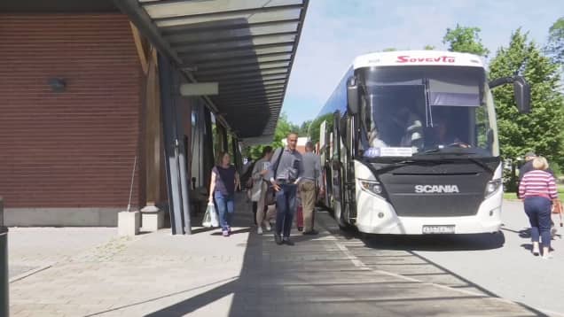 A Sovavto bus from Russia turns in front of the Lappeenranta bus station.