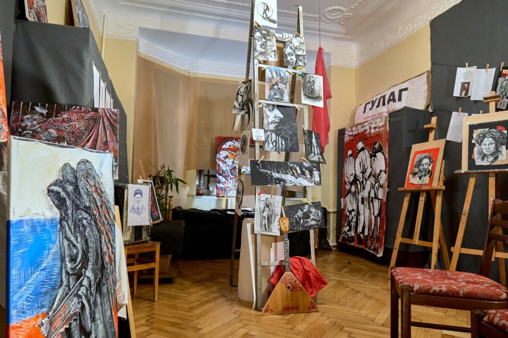The exhibition features works by current political prisoners, including those involved in the Network Case. Some of the works are dedicated to the victims of the Great Terror.
