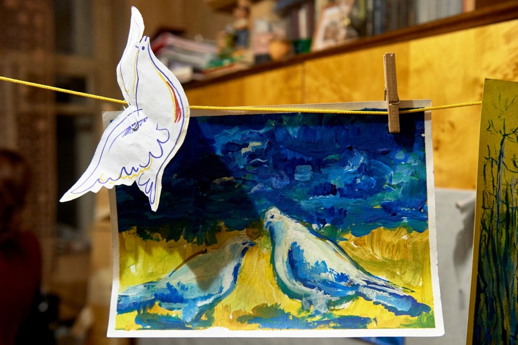 There is an art therapy group in the space, which has been led by Nikolai Boyarshinov’s wife Tatiana since May. The group’s members make postcards to fight burnout, stress and fear. They then send postcards to political prisoners.