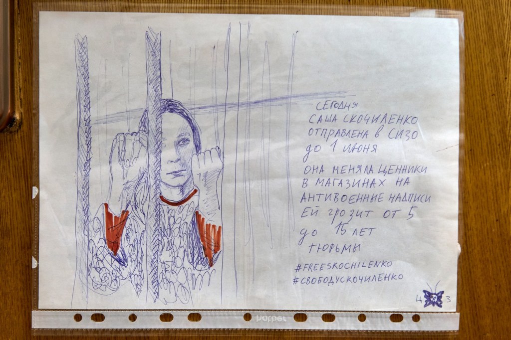 In a closet in the hallway there are drawings by the artist cyanide the angry [tsianid zloi]. Since February, he has been producing one image every day about the war and political crackdown. On the closet doors and inside it there are portraits of Sasha Skochilenko and Seva Korolev, who are charged with “discrediting” the Russian army, Kansk Teenagers Case defendant Nikita Uvarov, and scenes of Navalny in a cell.