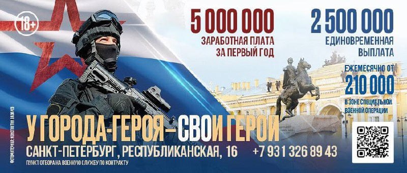 “A first-year salary of 5,000,000 rubles [approx. 48,000 euros]. A one-time [signing bonus] of 2,500,000 rubles. Monthly pay starting at 210,000 rubles [approx. 2,000 euros] in the special military operation zone. THE HERO CITY HAS ITS OWN HEROES. 16 Republican Street, Saint Petersburg, +7 931-326-8943.”