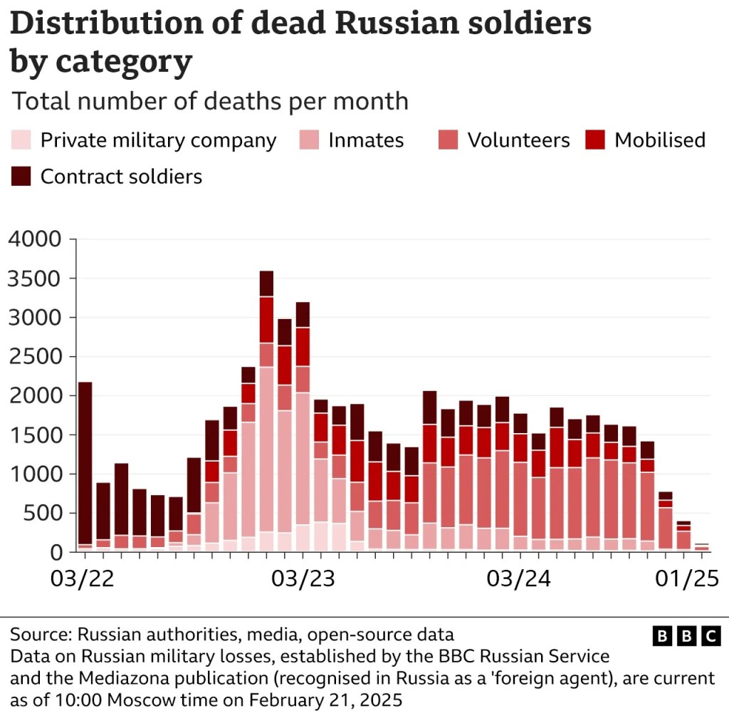 Ukraine last updated its casualty figures in December 2024, when President Volodymyr Zelensky acknowledged 43,000 Ukrainian deaths among soldiers and officers. Western analysts believe this figure to be an under-estimate.