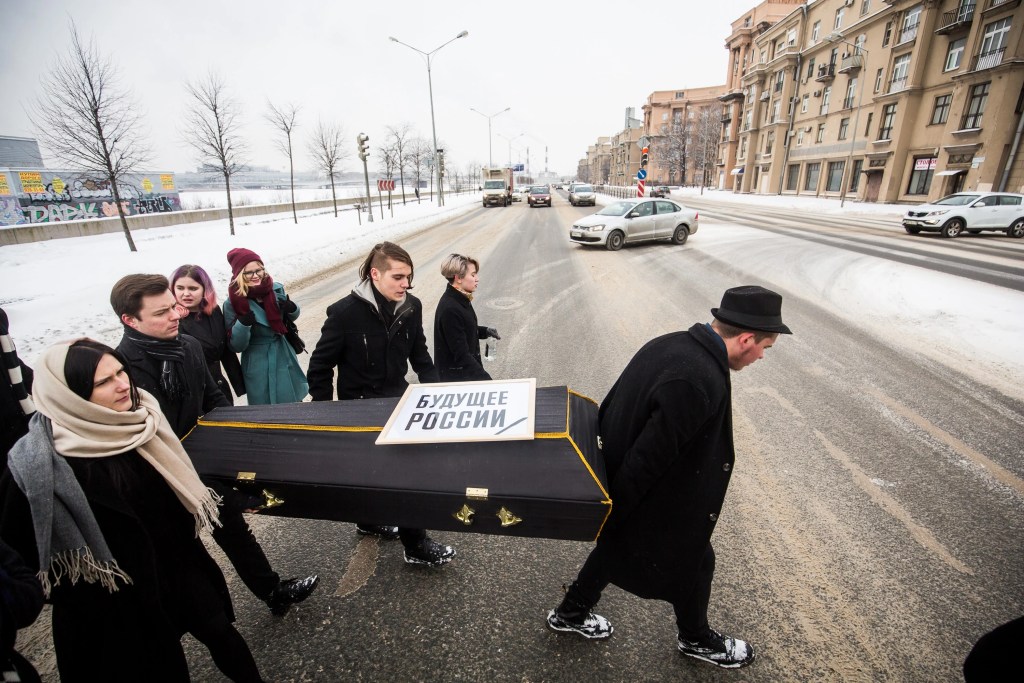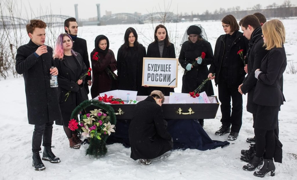 In January 2018, Vesna staged a mock funeral for Russia’s future: people dressed in mourning attire and with sorrowful expressions on their faces carried a coffin through the streets, adorned with children’s drawings that symbolized hopes for life in a free, democratic country.