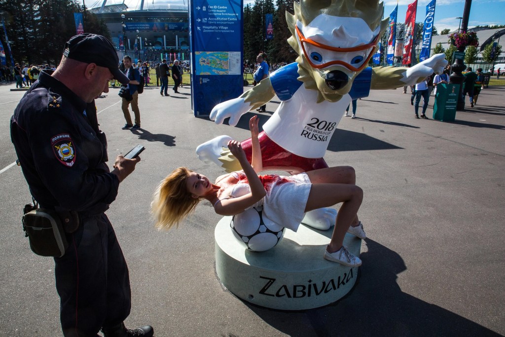 In the summer of 2018, when Russia was hosting the FIFA World Cup, Vesna activists unfurled a banner reading “This World Cup Is Filled with Blood” on Palace Bridge in Petersburg. Vesna timed another protest against [torture in police custody] to coincide with the World Cup—a young woman, doused in red paint, lay down on a pedestal beneath a replica of the tournament’s official mascot, the wolf Zabivaka.