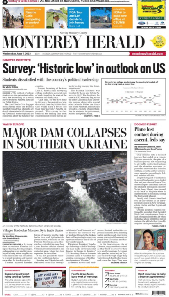 “Villages flooded as Moscow, Kyiv trade blame.” A screenshot of the front page of the 7 June 2023 Monterey Herald, as sent to this subscriber