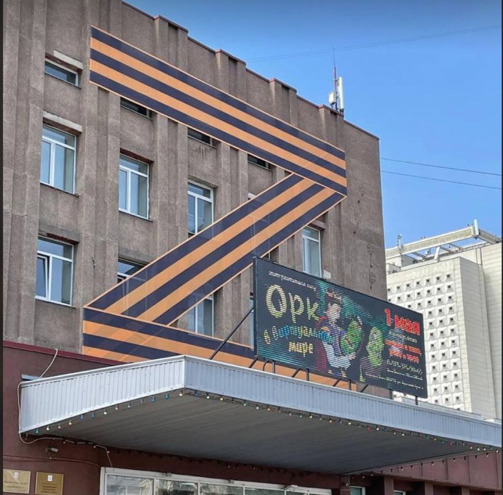 “Grozny. Aleppo. Mariupol. Kharkiv. Fascists Z Murderers.” Image courtesy of Radio Svoboda