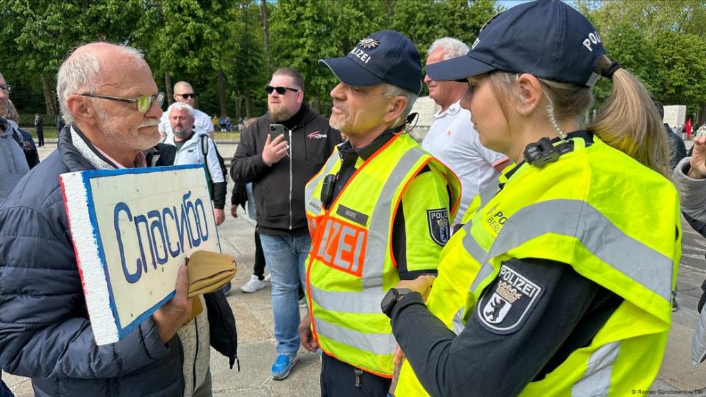 Against this backdrop, the scene resembled a mixture of a traditional Russian May ninth celebration and a political protest by German pacifists, many of whom had clearly lived most of their lives in the GDR.