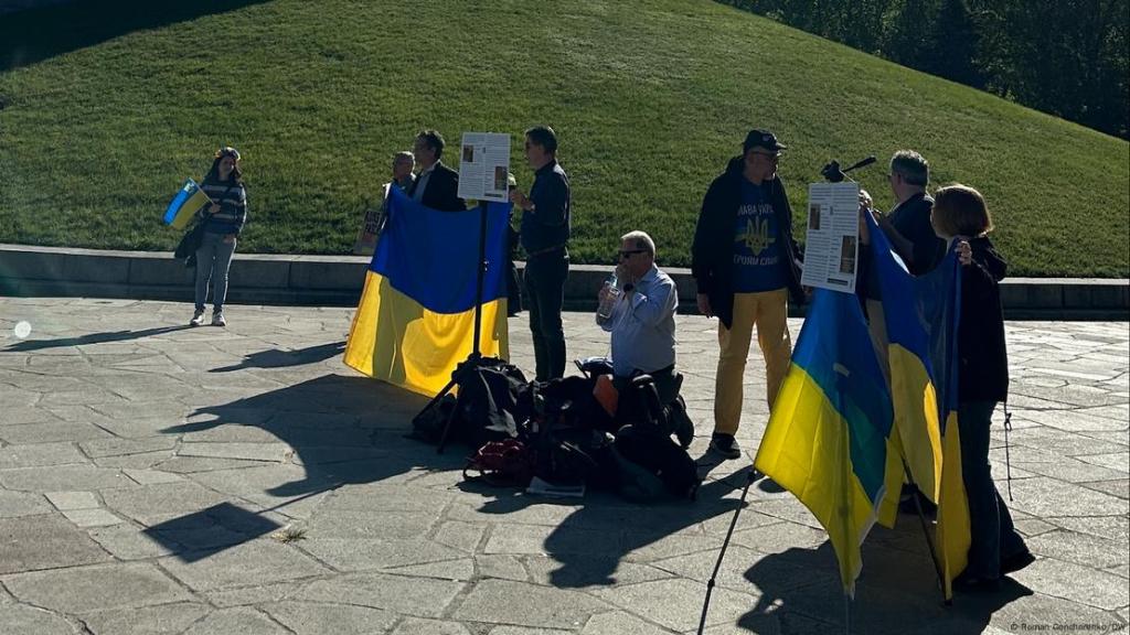 Activists with placards and Ukrainian flags at the monument to Soviet soldiers in Treptow Park, 9 May 2025. Photo: Roman Goncharenko/Deutsche Welle