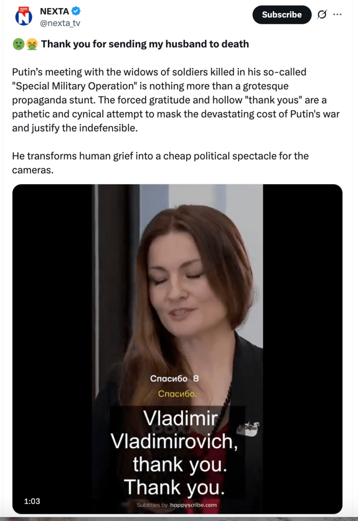 Vladimir Putin speaking with a group of Russian war widows. English subtitles by Julia Khazagaeva