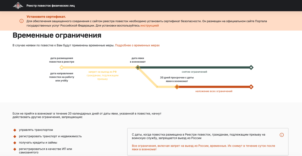 A screenshot of the military enlistment summons website, outlining the penalties imposed on Russians who fail to respond.