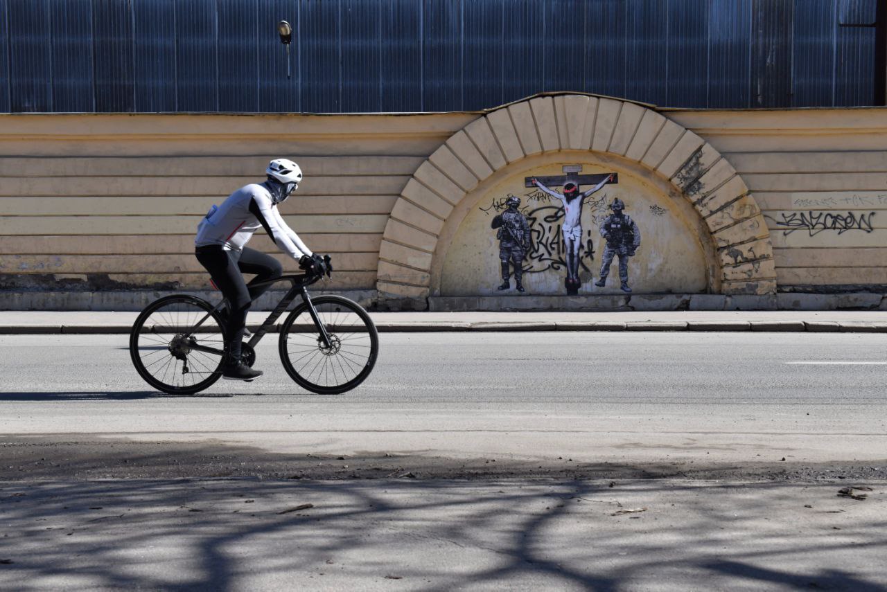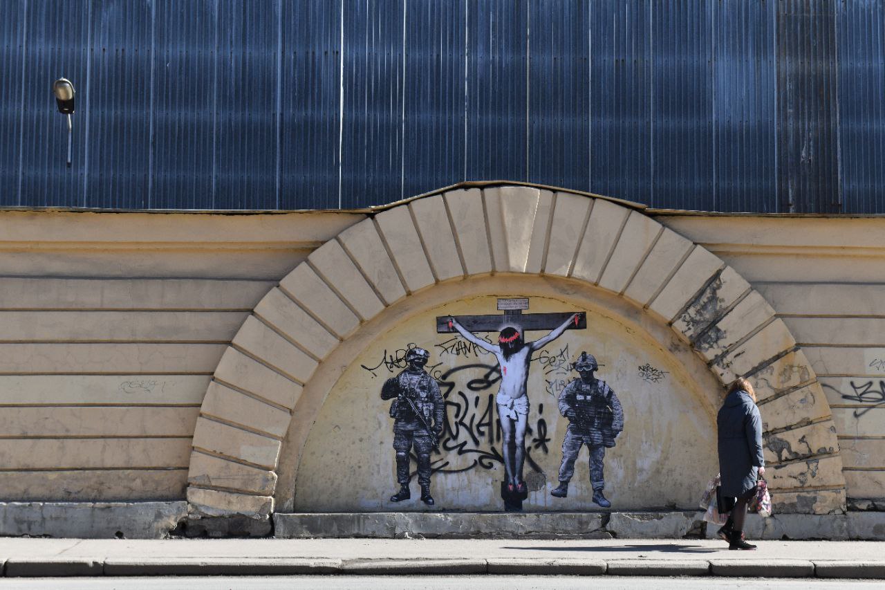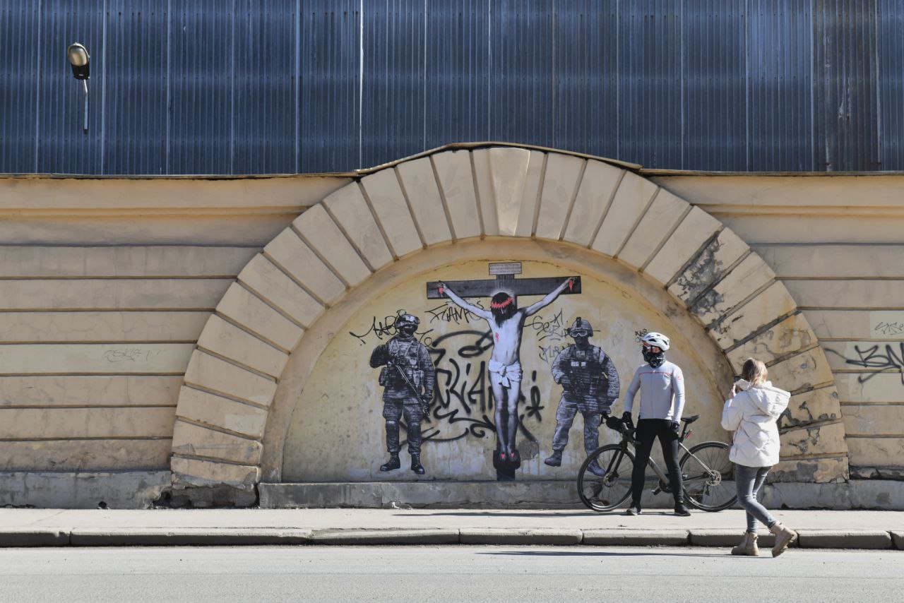 A piece of street art featuring a crucified Jesus Christ and two soldiers with no insignia on their uniforms has appeared on Vasilievsky Island’s Kosaya Liniya. As the author of the work, artist Vano Bogomaz, writes on Instagram, it is a collage that uses images from the internet and reproductions of Diego Velasquez’s painting Christ Crucified.