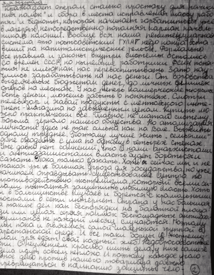 Our country is big, and things like the riots on Bolotnaya Square or the capture of ruthless antifa hooligan do not happen every months. So for the time we are the smallest group in the prison community. And yet the anti-extremism police eat their government-issued bread for nothing. They are unscrupulous. Although they are clumsy at fabricating cases, they are doing quite well for themselves. And so every criminal case against a comrade of ours must be turned into a campaign to defend the individual from the state’s power over him or her. All the punitive institutions of the state should be subjected to attack. We and the people are on one side, and this leviathan with legs and dressed in a uniform is on the other.