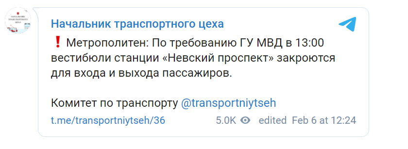A Telegram message from the Petersburg city transport committee, informing readers that Nevsky Prospekt subway would be closed at 1:00 p.m. n orders from the Interior Ministry