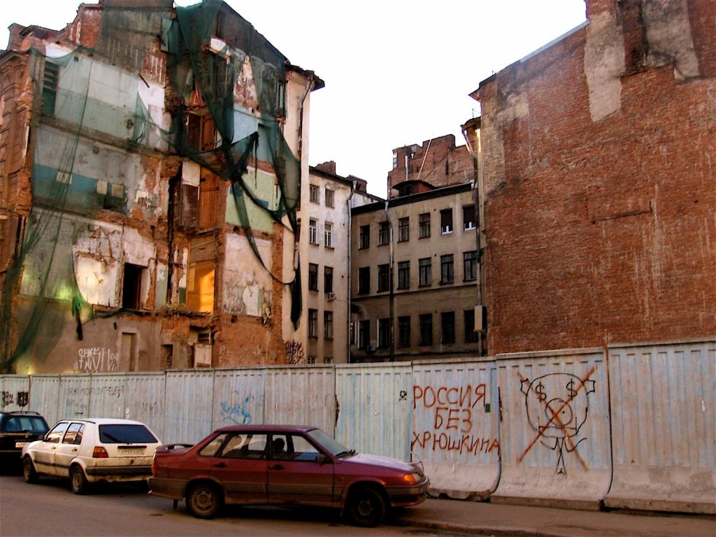 I want to paint one more, brief verbal portrait of another victim in this quiet civil war. This portrait is connected with the violence inflicted on this city and other parts of Serbia during the NATO bombing campaign of 1999. The official and popular reaction in Russia to this violence was quite harsh. There were massive demonstrations outside the US embassy in Moscow; unknown assailants even fired a grenade into an empty office at the embassy. What surprised me were the more spontaneous reactions to the bombings. One day, a young American artist and I were standing in the courtyard of the squat at Pushkinskaya-10 chatting with a local artist. Two acquaintances of ours—members of a well-regarded alternative theater troupe—entered the courtyard. When they saw us, they shouted, “Don’t talk to those Americans! They’re bombing our Serbian brothers!” Since they said all this with a smile, it was hard to know to what extent we were supposed to take their warning as a “joke.”