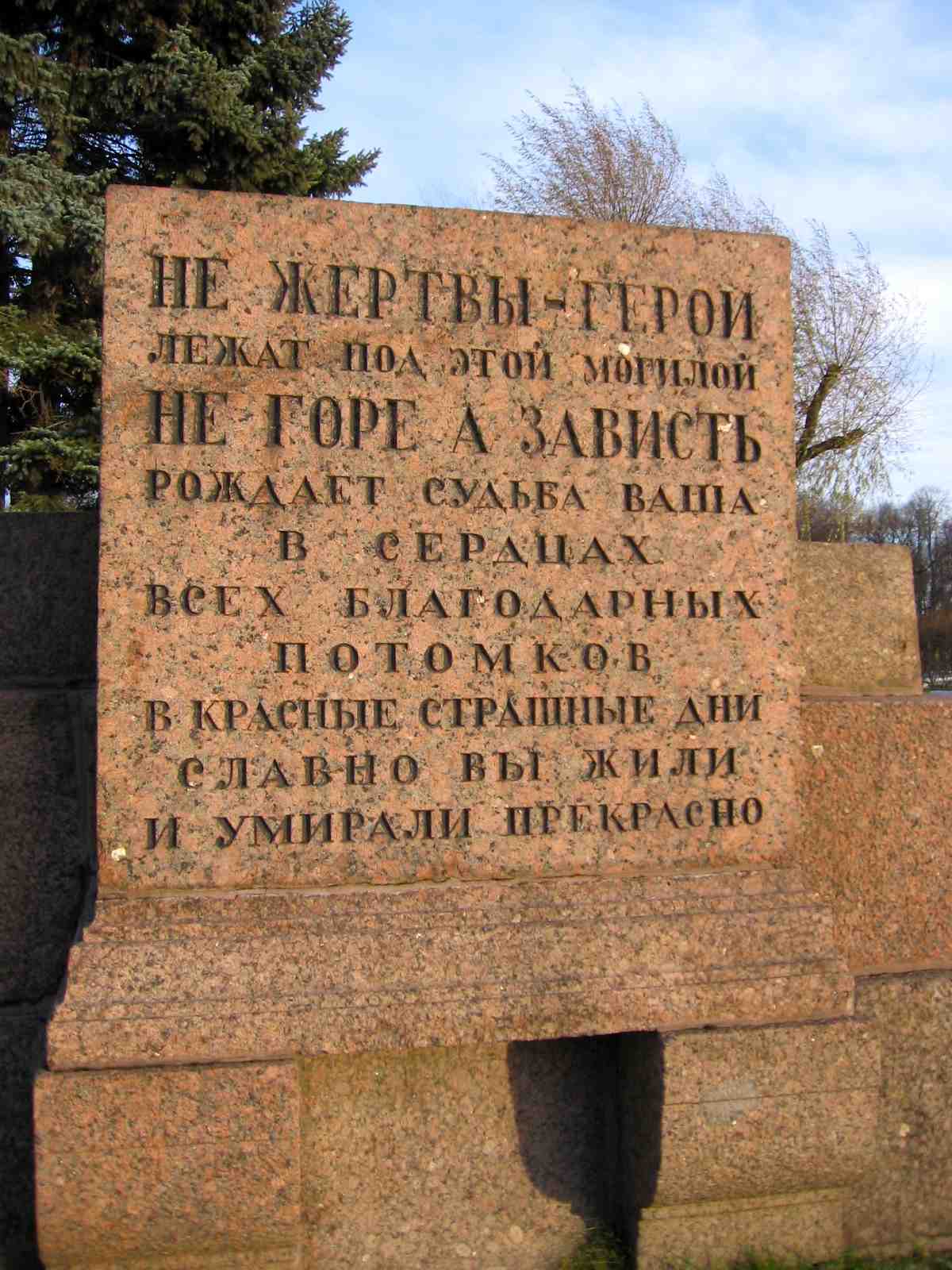 We are on the Field of Mars in Petersburg, at the Monument to the Fighters of the Revolution. That is the official name. The question immediately arises: to the fighters of which revolution? This is not specified in the official name. The epitaphs, penned by the first Soviet minister of education Anatoly Lunacharsky in 1919, are more lyrical than informative, referring to previous revolutions and historical figures, including the Jacobins and the Paris Communards. Only this humble gravestone refers to the primordial event: here lie the victims of the February Revolution of 1917.