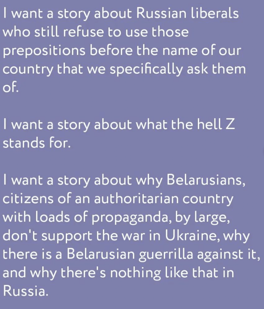 Source: Zhenya Oliinyk (@evilpinkpics), Instagram, 15 April 2022. Thanks to Bosla Arts for the heads-up. I took the liberty of cropping the seven panels of Ms. Oliinyk’s original message (which I very much took to heart) and stacking them into a single image/text.