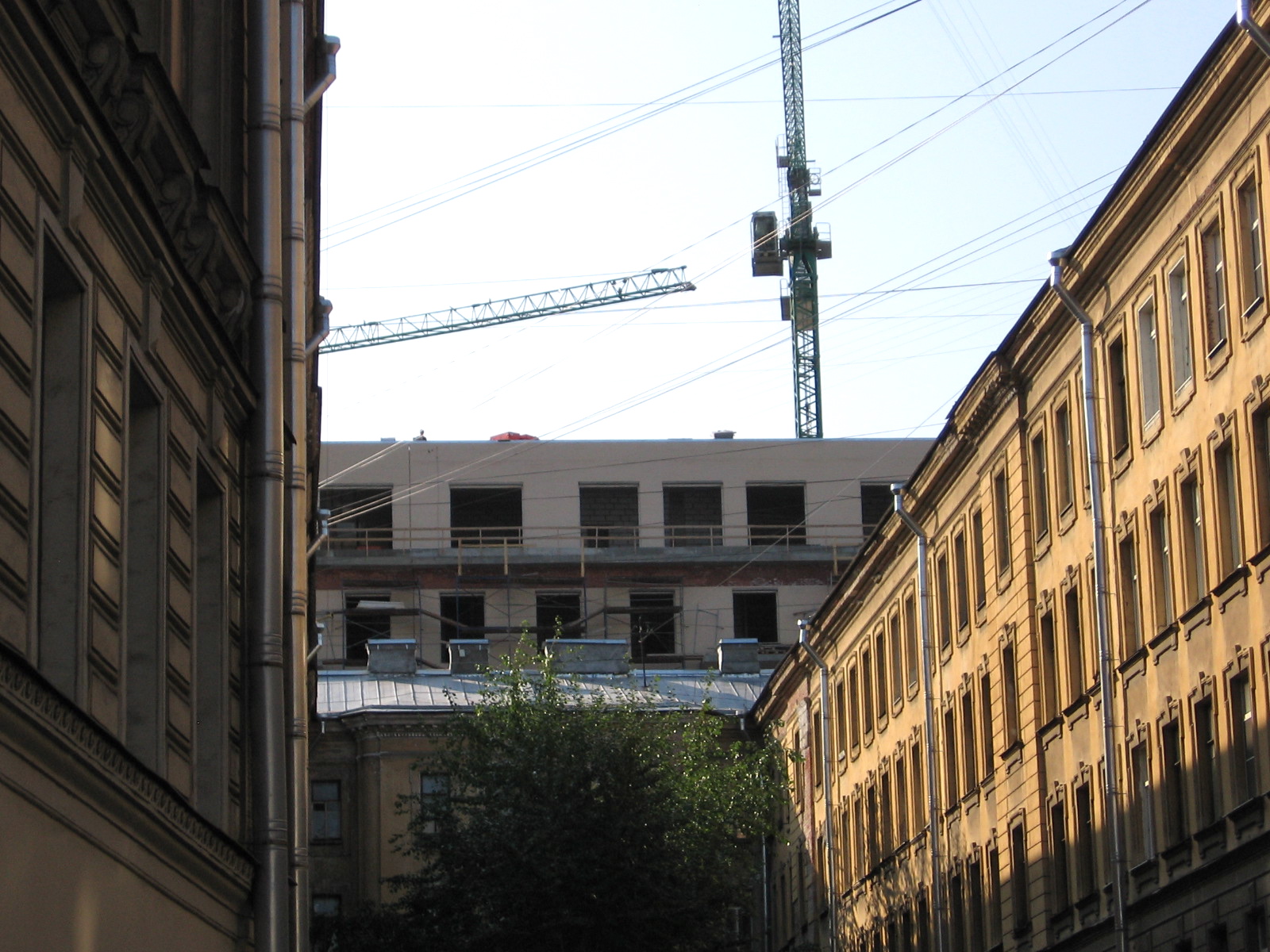 To make way for the elite complex, a pre-Revolutionary building originally designed as a block of rented flats for State Bank employees was demolished. The five-storey house was built in 1898–1901 and designed by architect Heinrich Bertels. After investor Hovard SPb, Ltd., took an interest in the site (according to rumors, the company has personal ties to former Petersburg governor and current Federation council chair Valentina Matviyenko), residents of the dormitory that had been housed in the Bertels building were forcibly evicted to the village of Shushary, outside the Petersburg city limits. [Translator’s Note.The June 2012 linked to here paints a slightly more complicated picture of how the now-demolished building was resettled.]