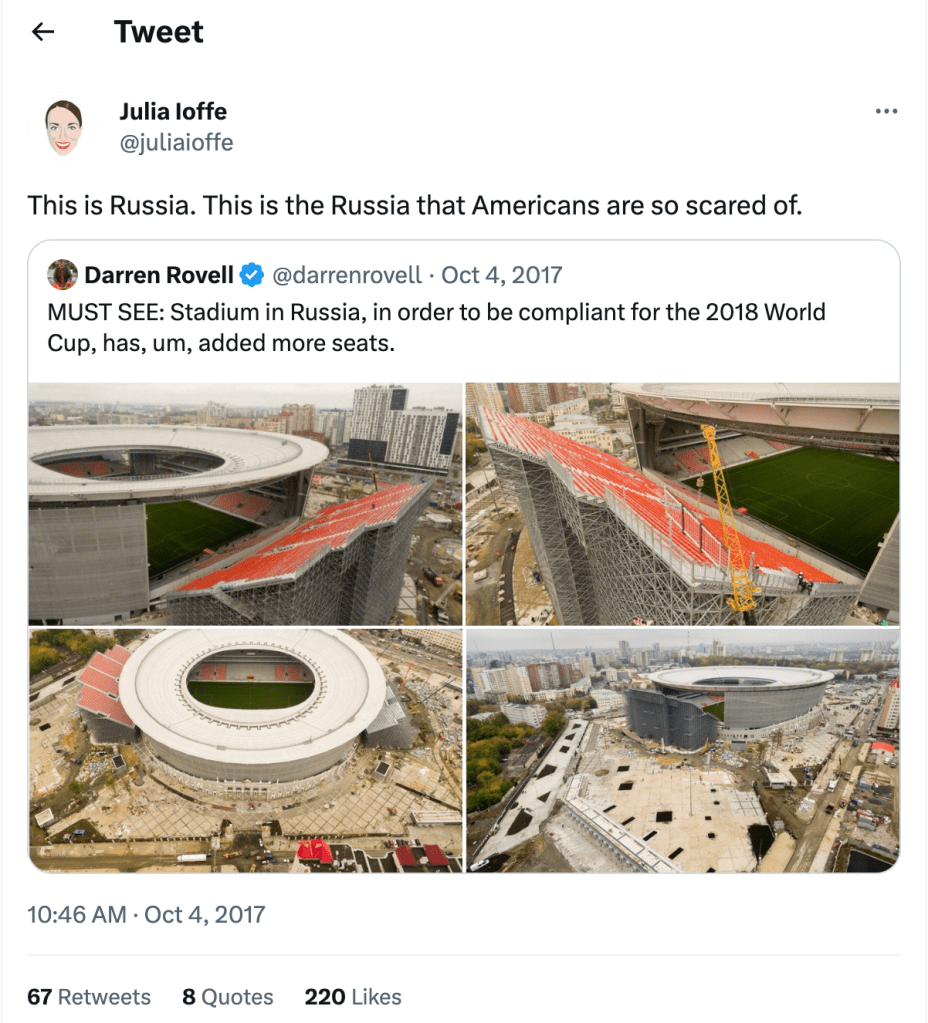 No, the bottom line is that reporters like Masha Gessen and Julia Ioffe, for whatever reason, want to control the public discourse on Russia in the US, so they have to reach over and over again for the bag of tricks, perfected in their worst incarnations by pseudo-intellectual mags like the New Republic and Atlantic Monthly in the nineties, that counter-intuitive reporting gets you, the reporter, the most attention, even if your counter-intuitive argument is utterly worthless when examined on the merits.