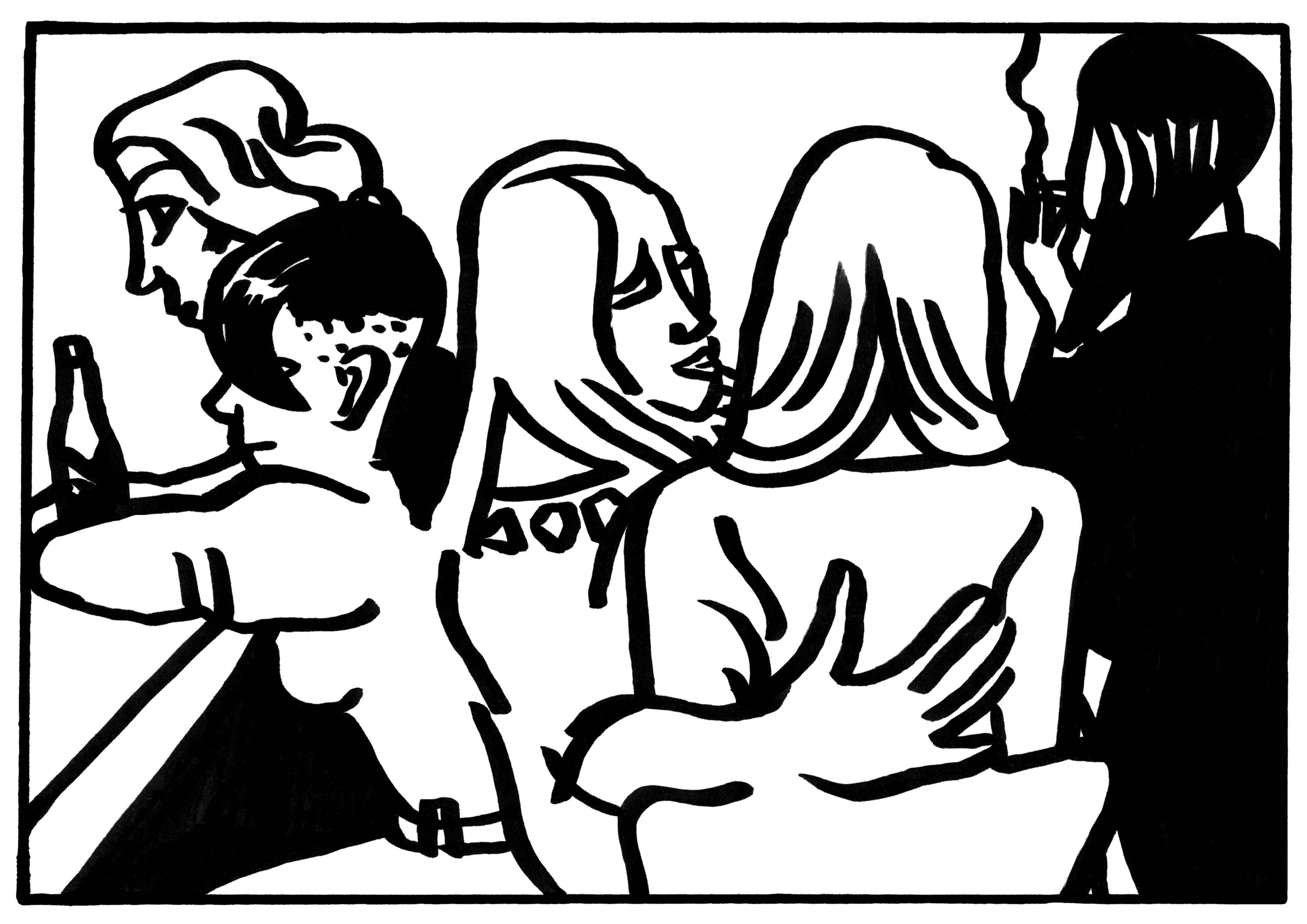 The subjects and viewers of my series 18+ often ask why a heterosexual female artist would draw lesbian couples. I have a few answers to that question, but the most truthful would be that what is so fascinating about lesbian clubs is not so much the distinctive sexuality there as the separate feminine environment in which the male’s role at the center of the female universe has been reduced to zero. The chance to depict the complex psychological connections between women is captivating. There are few works from this perspective in art. In public life, attraction between women is almost never manifested. By doing a number of drawings in semi-private lesbian clubs, I was looking for a new visual language. Lesbian couples have a different way of gesturing and moving than heterosexual couples.