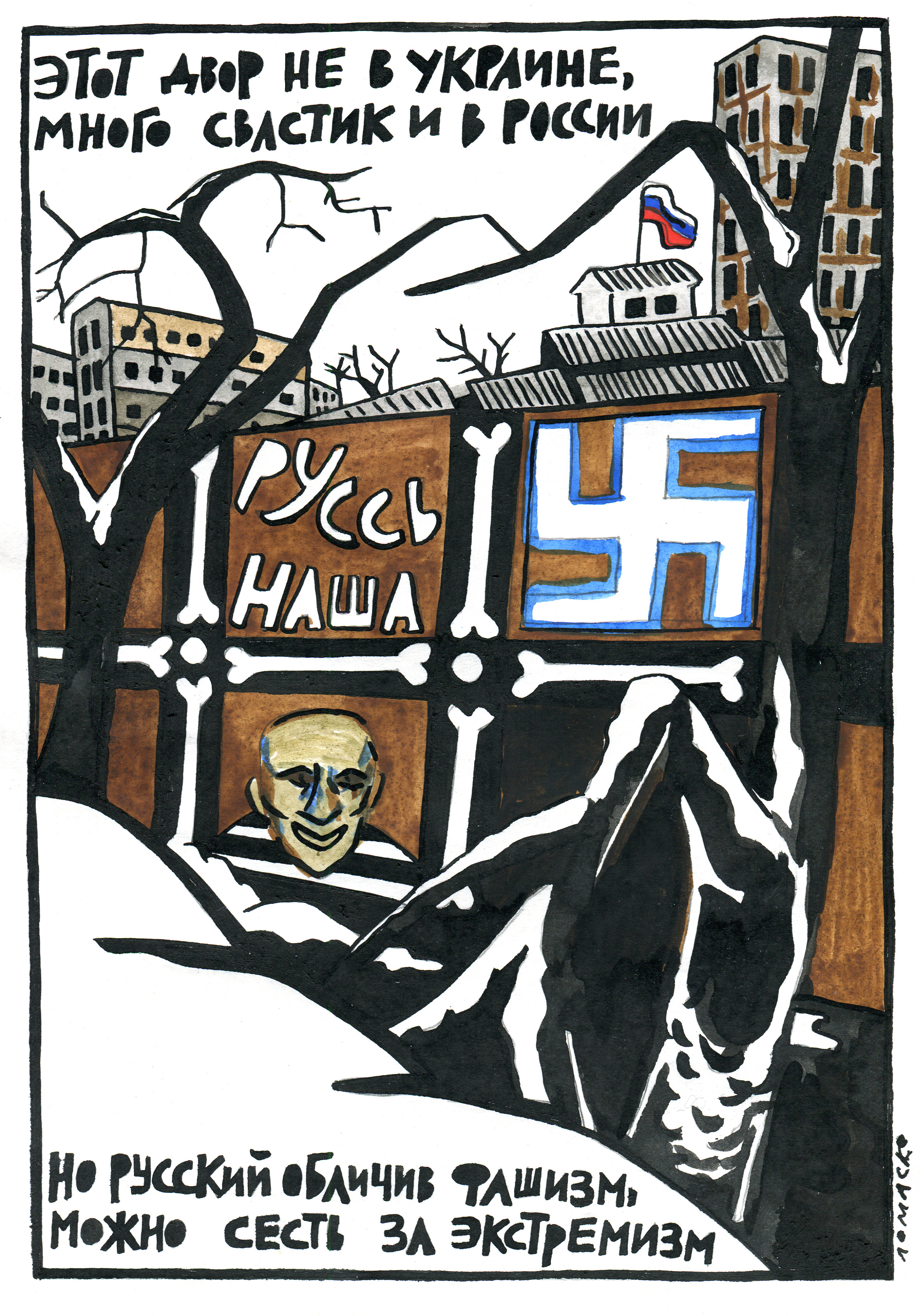 Do I have the right to draw and show you this landscape featuring a swastika, a landscape that is fairly typical in Russia? During the recent trial of the Combat Organization of Russian Nationalists (BORN), their lawyer argued that the anti-fascists are just another street gang like the fascists. So why not label any denunciation of fascism “propaganda” of fascism itself?