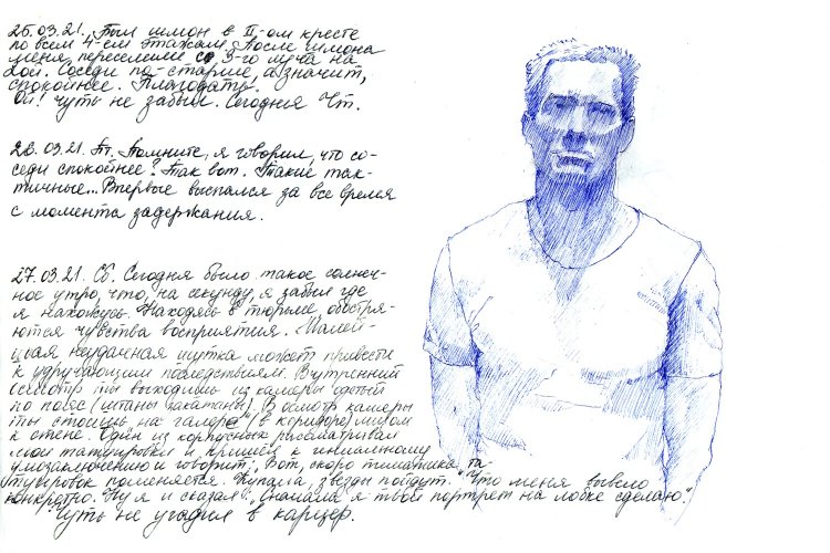 In the pre-trial detention center, Pershin has been keeping a diary, in which he writes about his feelings, everyday life and the people he meets. He gave part of his diary to OVD Info through his lawyer. We have published excerpts from it below. Some parts of the diary have been blurred at Pershin’s request. The original spelling and punctuation have been preserved.