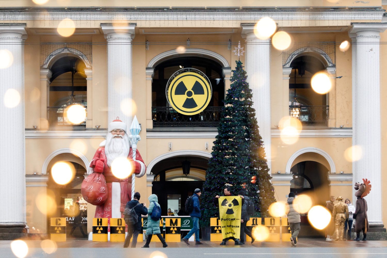 Exactly a year ago, on December 17, 20198, Rashid Alimov held a protest action entitled “Russia Is Not a Nuclear Dump” on Nevsky Prospekt outside of Gostiny Dvor. Alimov stood with a banner reading “Russia is not a nuclear dump” at the central entrance to the Gostiny Dvor shopping center. Behind him were activists eleven metal barrels painted with the radioactive danger sign and letters forming inscription “Happy New Year.”