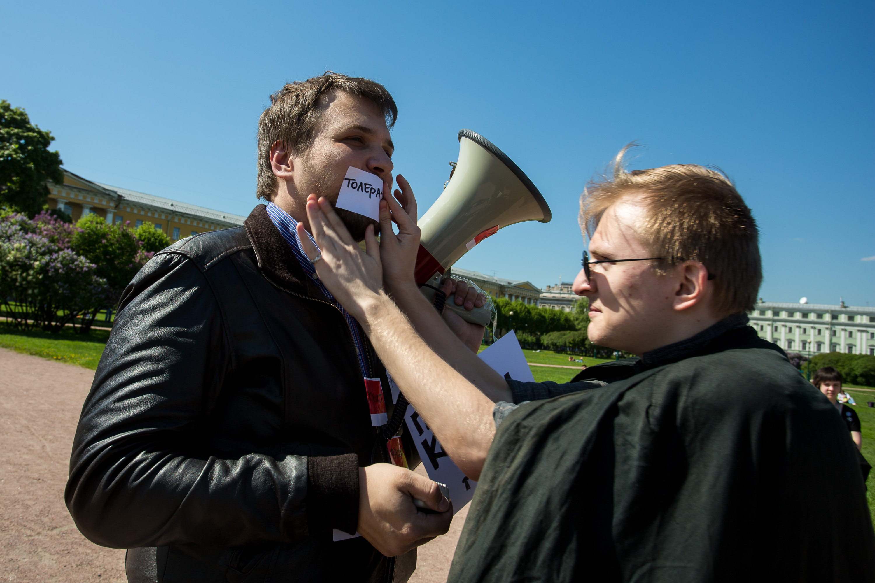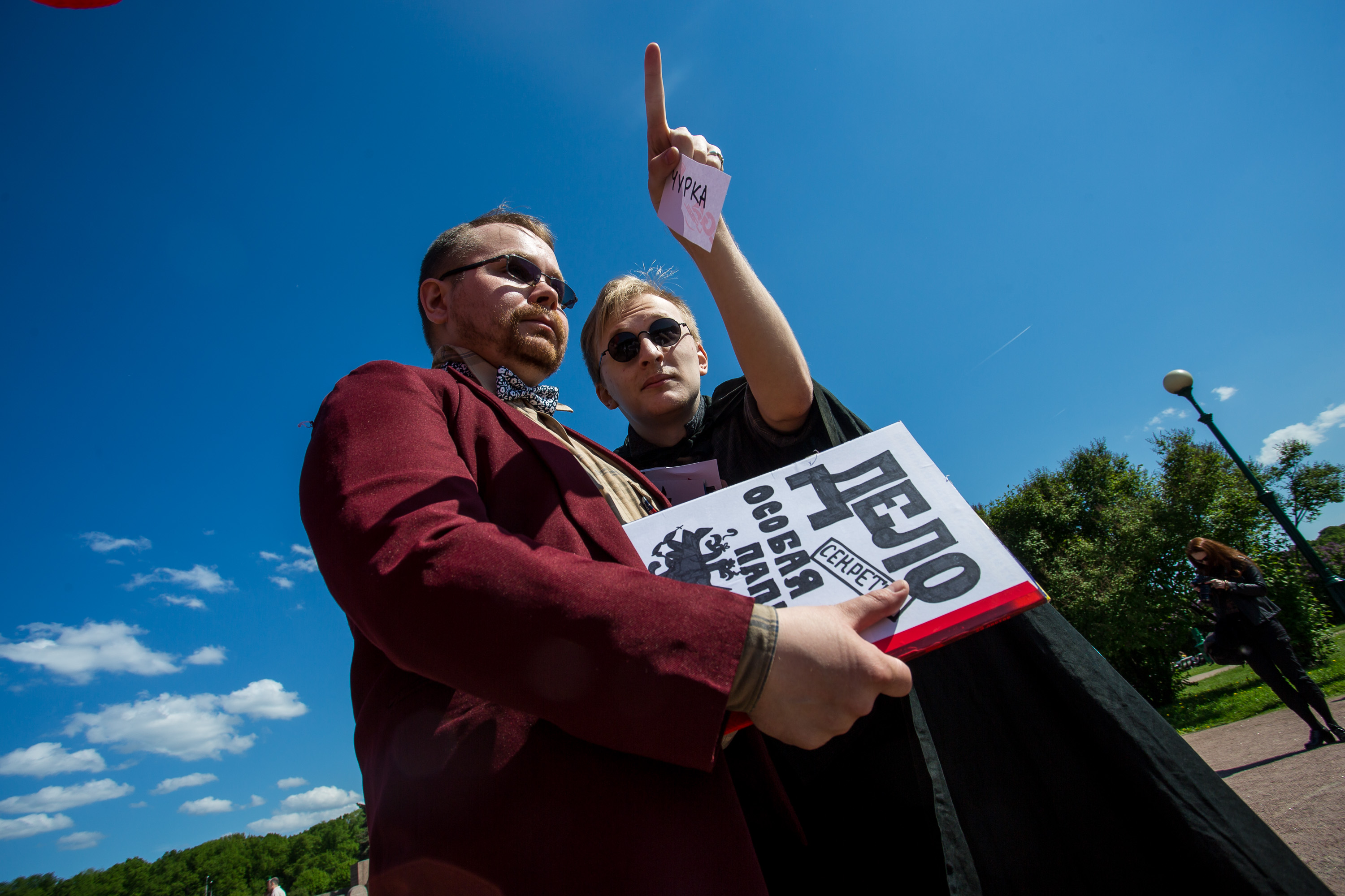 On Saturday, May 30, activists from the Russian Socialist Movement (RSD) organized a theatrical protest rally, entitled “#I Am Sergei Vilkov, or Pinning Labels,” on the Field of Mars in central Petersburg.