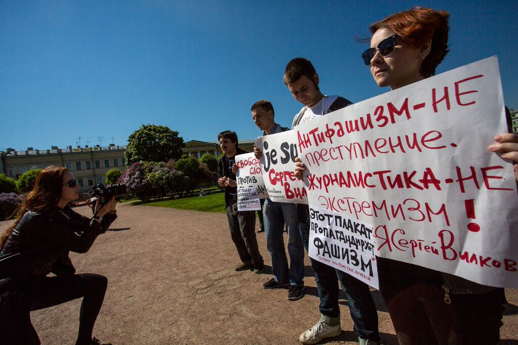 Socialist activists rallying in support of Saratov journalist Sergei Vilkov in Petersburg, May 30, 2015. The placard on the far right reads, “Antifascism is not a crime, journalism is not extremism. I am Sergei Vilkov.”