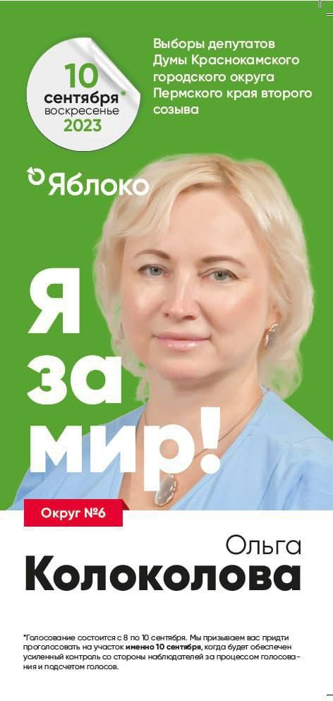 Olga Kolokolova, the head of the Perm regional branch of the Yabloko Party for many years, won the elections to the City Duma in Krasnokamsk (a satellite city of Perm). Moreover, she won running on the slogan “I’m for peace!”